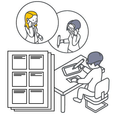 Die Entstehung eines Infocomics hängt von den zeitlichen Verfügbarkeiten aller Beteiligten ab. Bitte rechnen Sie viel Zeit für Feedbackschleifen ein. Nur eine Vorlaufzeit, die dem Projektumfang entspricht, ermöglicht eine sichere und konzentrierte Durchführung. Eine Solo.Seite kann etwa eine Woche dauern, komplexere Projekte auch einmal Monate in Anspruch nehmen.